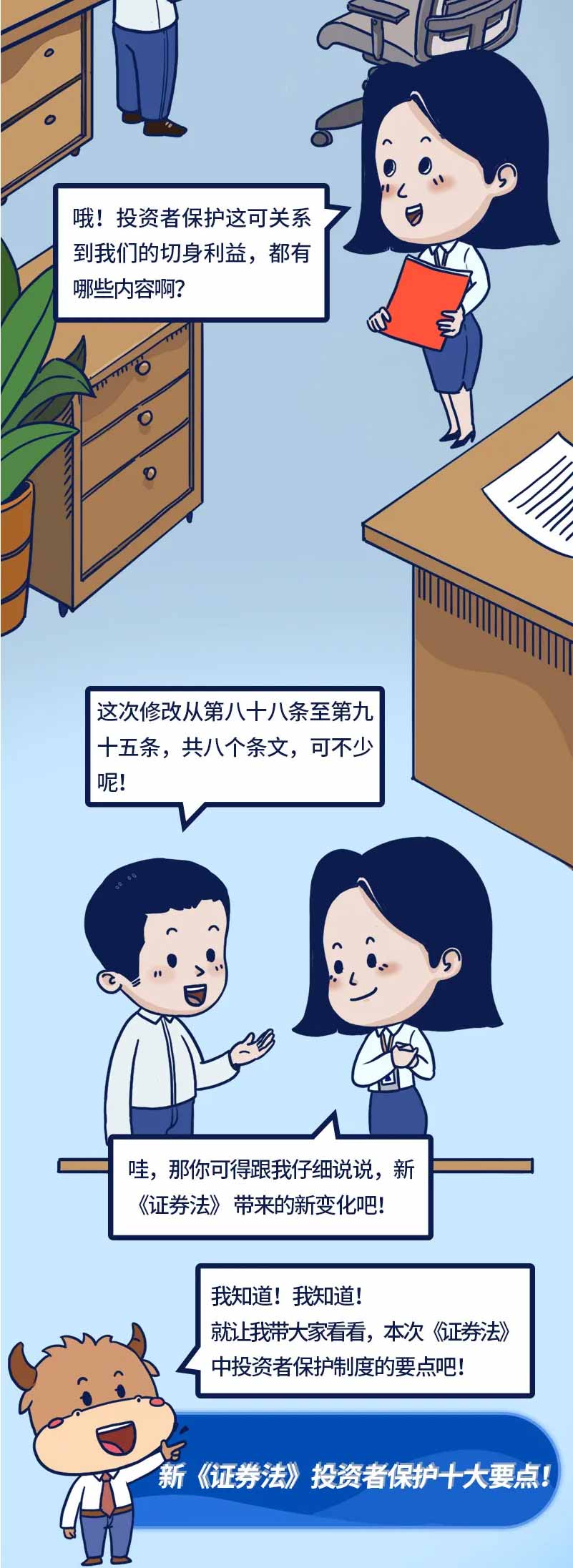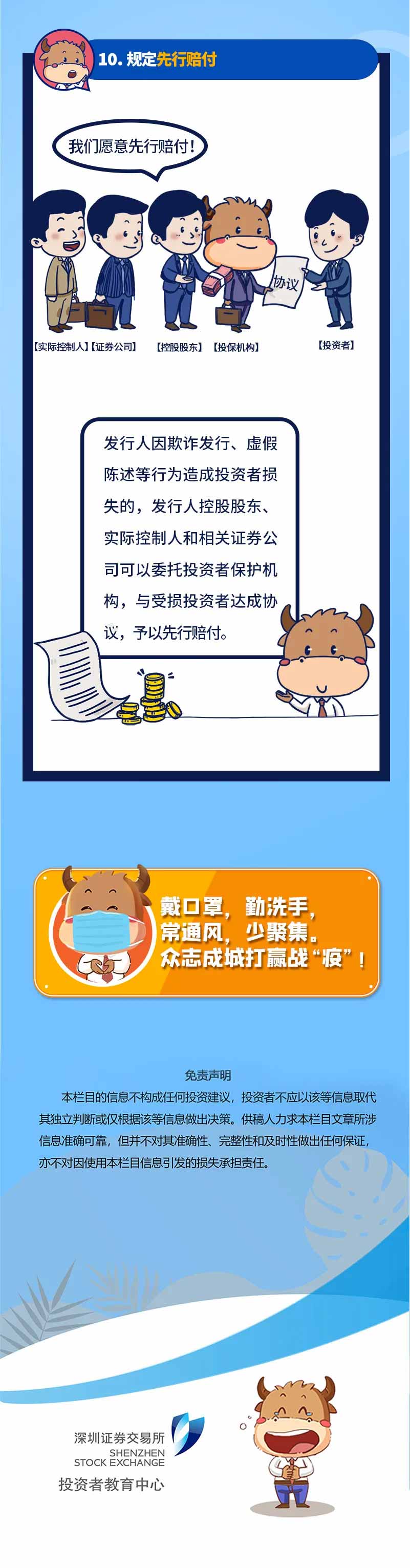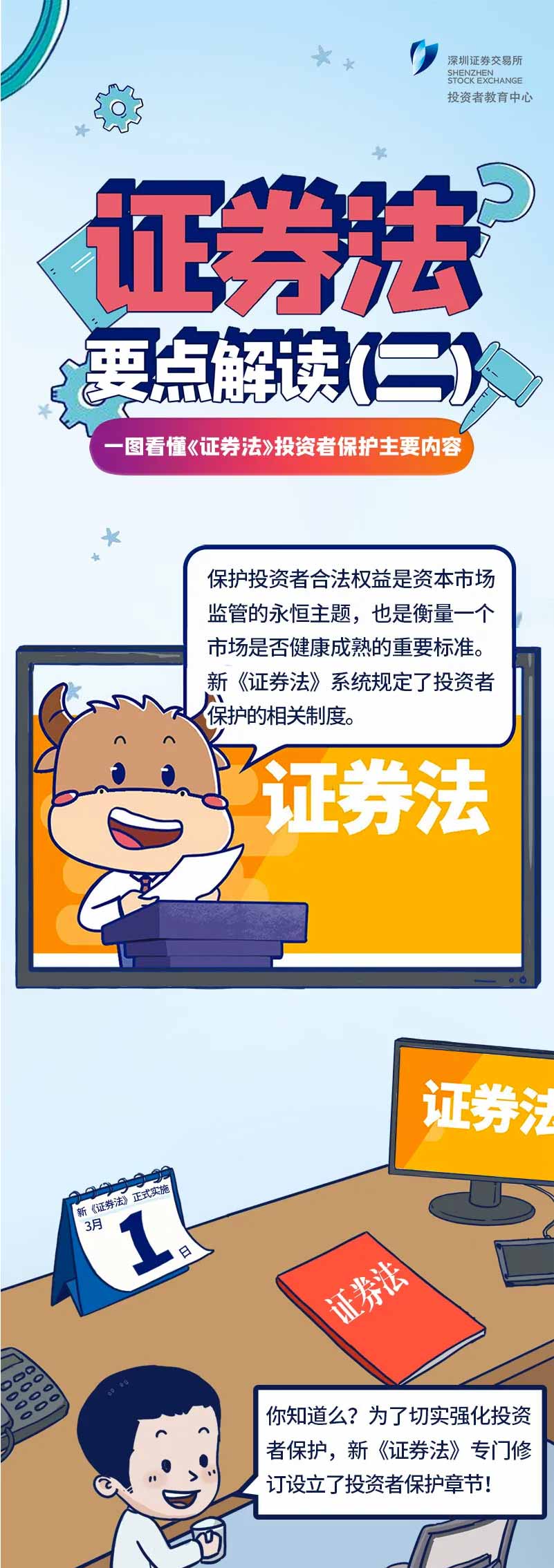 為進一步做好《證券法》的普及宣傳,增強投資者自我保護能力,引導投資者更好知法、懂法、守法,深交所投教中心推出過“《證券法》要點解讀”系列投教產品。它以漫畫形式生動簡明地解讀了五大內容:主要修訂內容、投資者保護主要內容、信息披露專章、證券交易專章及證券交易所的新變化。