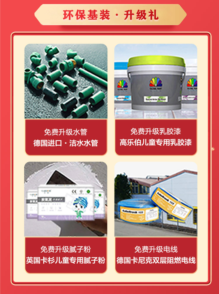 為確保每一位客戶都能享受到高品質的裝修體驗,我們將免費升級環保基裝。包括但不限于材料升級不加價、、隱蔽工程終身質保等實惠措施,免費升級為德國進口潔水水管,免費升級為高樂伯環保乳膠漆,免費升級為兒童膩子粉,免費升級進口阻燃電線。讓您在享受優惠的同時,更能安心無憂地迎接新家的誕生。